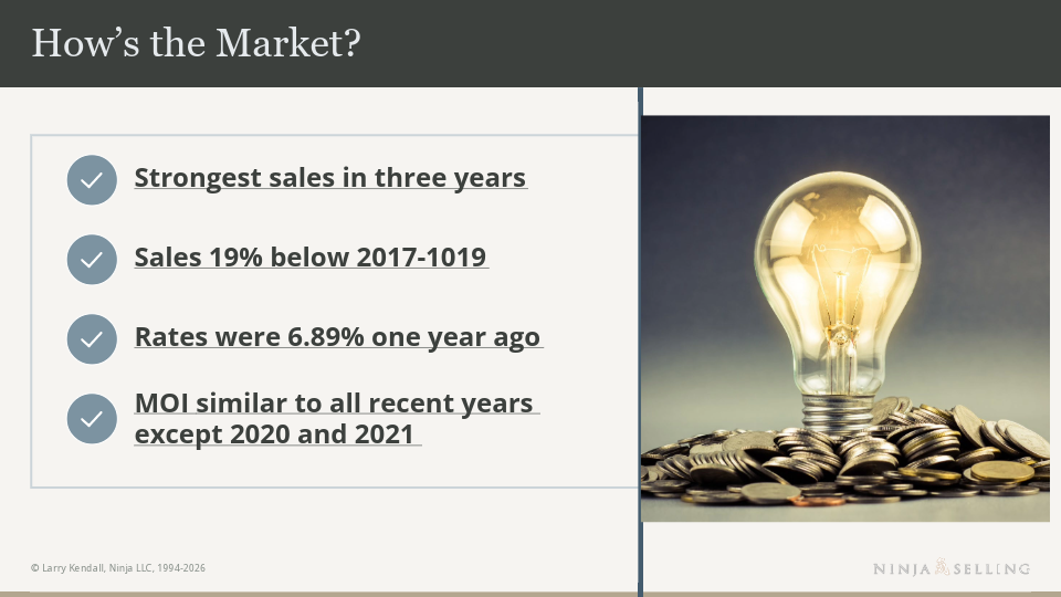 For the Sellers out here, there is about 10% more Inventory therefore more competition, which explains the increase in Days on market. But the inventory is still well below pre-COVID levels.