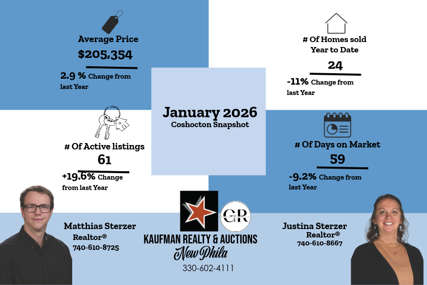 The national Average Sales price is around $405,000. Coshocton comes in around half that price at $205,000. In Coshocton, the Average sales price is up 2.9% compared to last year, while the National market is flat right now, with a 0.4% increase.
